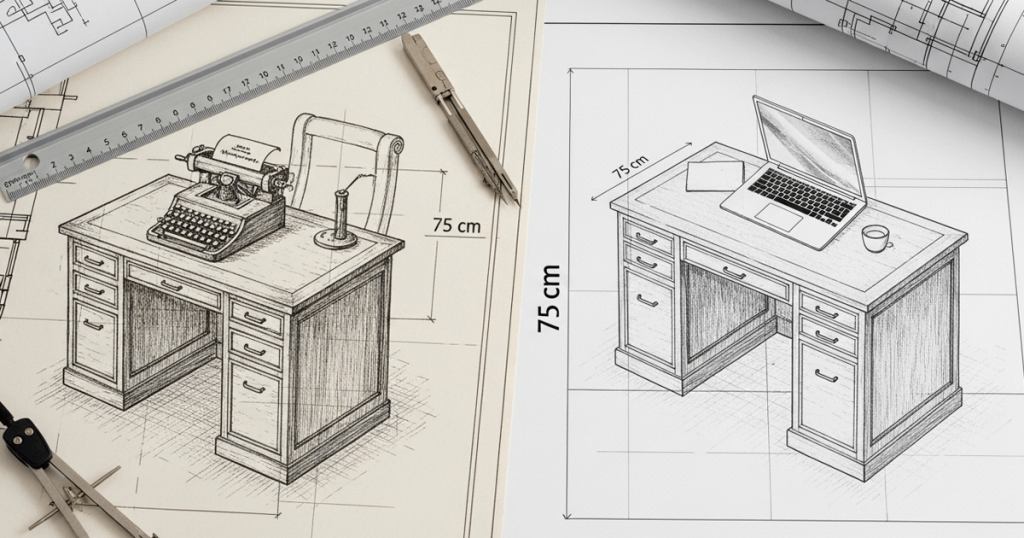 La medida no es simple capricho. Viene de normas ergonómicas desarrolladas durante el siglo XX, cuando el trabajo de oficina significaba principalmente escribir a máquina y papel. Esas normas tuvieron como referencia una estatura promedio que, en aquel contexto, era casi toda masculina y occidental.